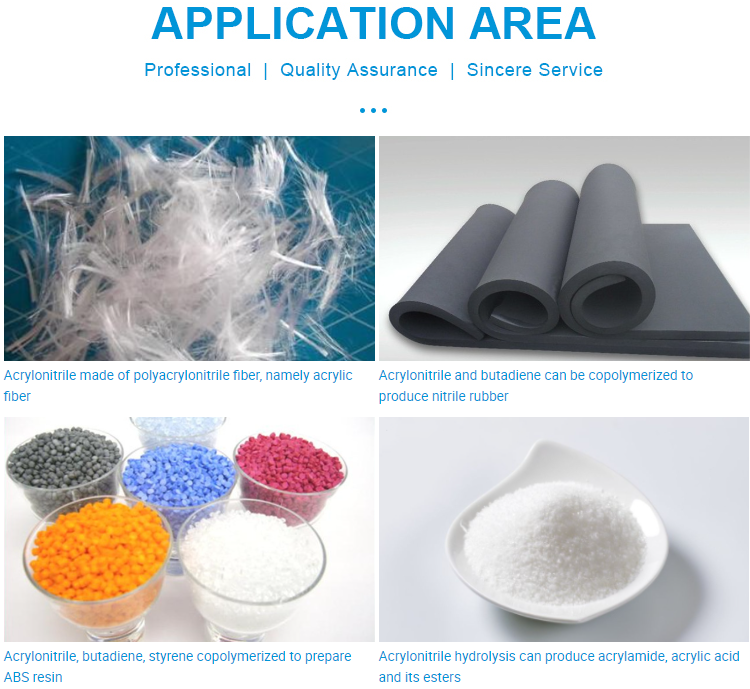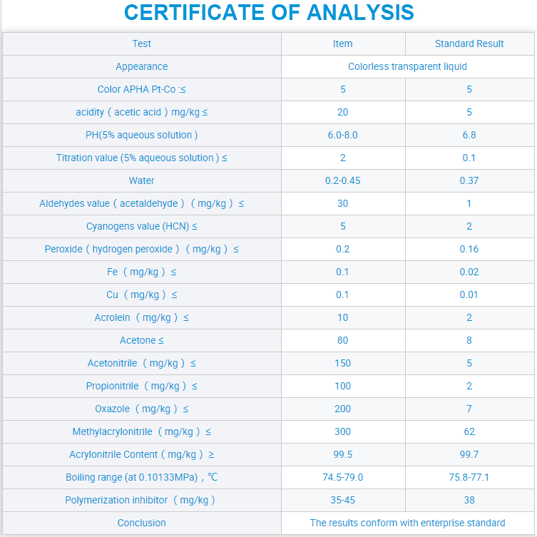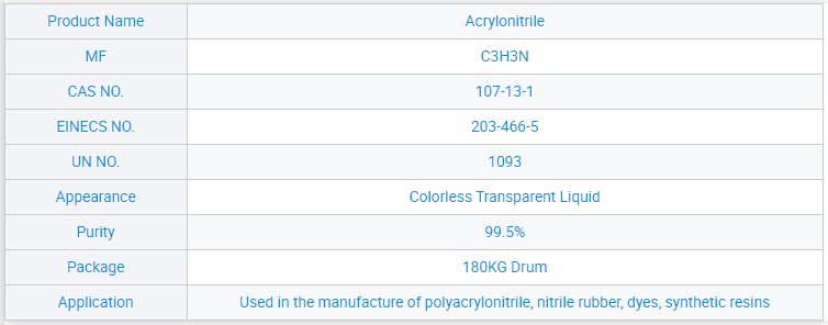 CAS No.:107-13-1 MF:C3H3N EINECS No.:203-466-5 Purity:99.5% Application:Manufacturing Polyacrylonitrile/Nitrile Rubber Appearance:Transparent Colorless Liquid Port of loading:Qingdao, Tianjin, Shanghai Packing:180KG Drum Melting Point:-83.6 ℃ Boiling Point:77.35 ℃ Density:0.806g/cm³ Molecular Weight:53.0626 UN No:1093 Quantity:14.4MTS/20`FCL Certificate:ISO COA MSDS
