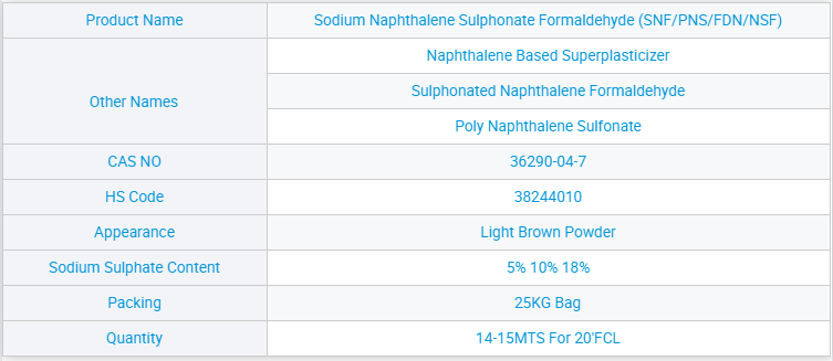 Other Names:Sodium Naphthalene Sulphonate Formaldehyde/Naphthalene Based Superplasticizer/